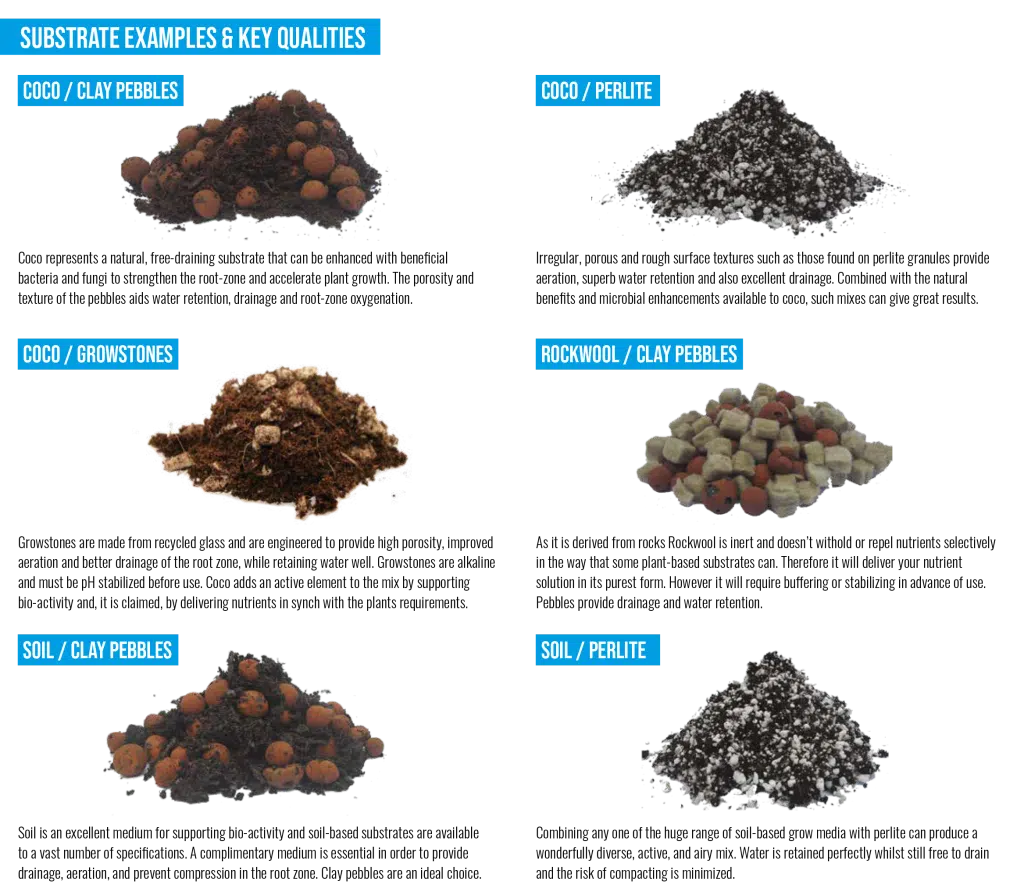 Use a blended substrate with good oxygen retention: Most growers typically use coco or soil blended with something like perlite or hydroton to improve aeration. Avoid using 100% coco/soil with no aeration or a substrate that’s too heavy, such as peat moss, as it will compress over time and reduce oxygen content in the root zone. With that said, you can always add extra perlite to any mix to make it lighter. We recommend starting with a 50/50 blend of coco or soil and perlite, pH-stabilized clay pebbles, growstones or Hydroton. Whatever you use to lighten your substrate blend to improve aeration, make sure it’s either inert or pH stabilized!