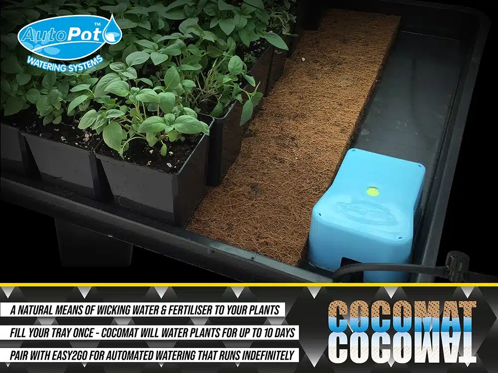 For those who want an ultra low-tech means of watering young plants, CocoMat is a superb way to go. This coco coir and natural latex matting is laid into any size garden tray with a root control sheet on top. Pots or trays of plants or seedlings are placed atop the root control sheet. With your tray filled, CocoMat then effectively acts as a wick, allowing the plants to draw up water at exactly their desired rate. There’s nothing to fear in terms of plants being starved or overwhelmed, they’ll do exactly as they please and develop more healthily and more fully for it. The matting is easily cut to size and can water for up to 10 days if manually filling the tray. These are great for turning any size smaller tray into a bottom feeding system in a pinch for a quick vacation. To take it one step further, pair a CocoMat with an easy2go kit + AQUAvalve to create an ultra-low-maintenance automated system with an attached reservoir.