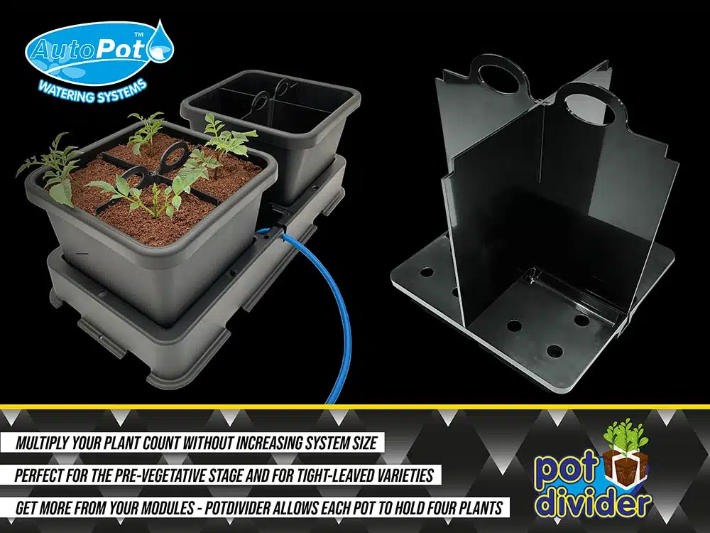 Beyond the propagation stage we move into kits that quickly, inexpensively adapt our pot-and-tray modules for use with growth-stage plants. Prime amongst these kits is PotDivider. This handy insert allows you to segregate your pot into four sections, ideal for starting off smaller plants. Once planted up, your ‘PotDivider’ pot sits in a module tray that is connected via pipework to a reservoir. We have a 2.2 gallon PotDivider and 3.9 gallon PotDivider.