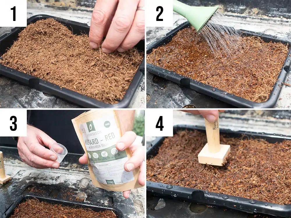 Above: Potting up in microgreens trays – 1. Add media – 2. Dampen media – 3. Sow seeds. – 4. Use dibber to insert