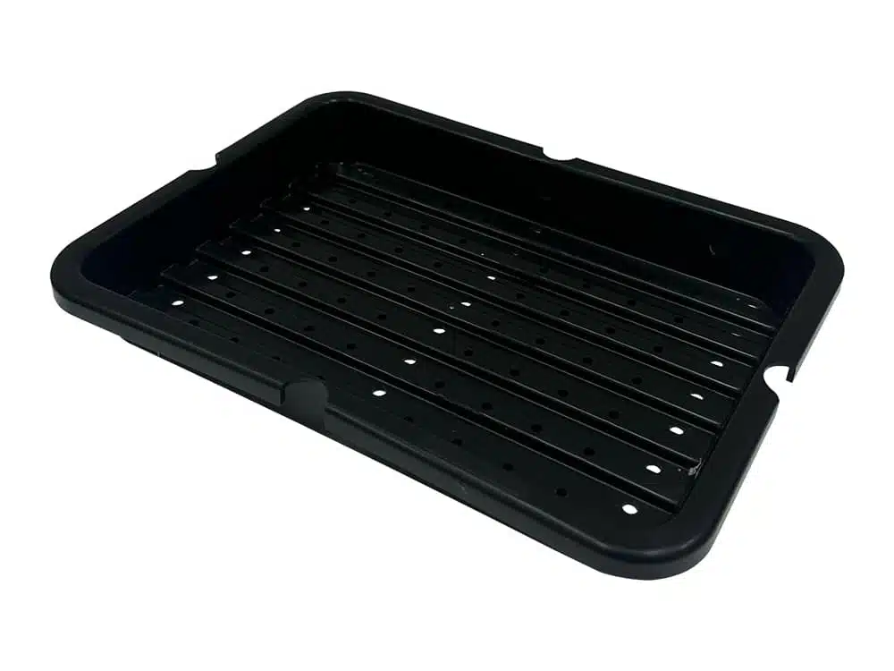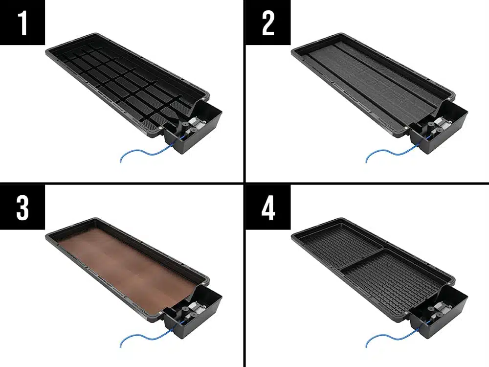 Each Tray2Grow platform holds up to two large trays or eight minis. These trays are specially designed with precision perforations that allow just the right amount of water to wick up through the media, thanks to the capillary mat underneath.