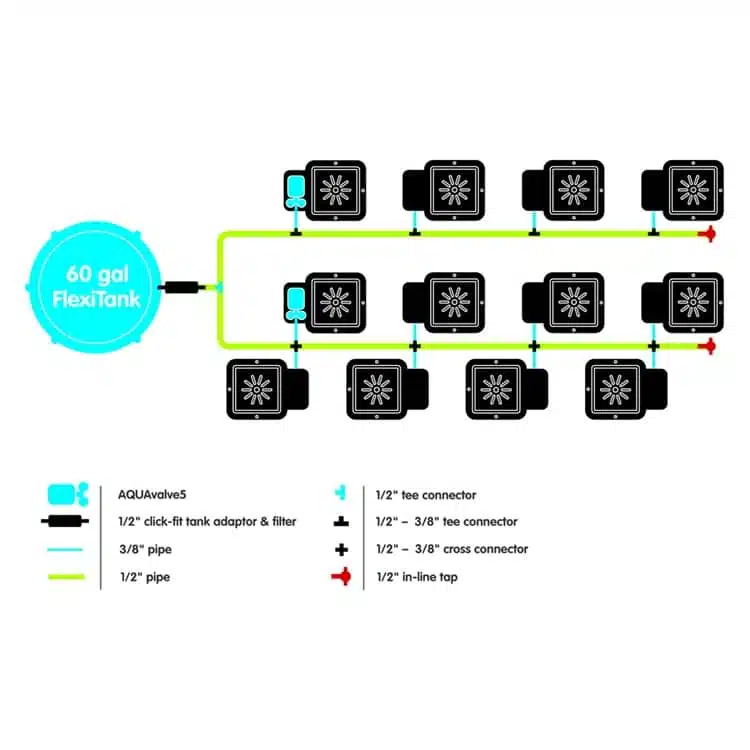 The 12Pot System is easily extended so many pots can be linked to a single reservoir. Please see examples of typical layouts using 3/8″ pipe or 1/2” pipe in the image gallery. The pots & trays can be easily moved at will, if the plants grow too large they can be spaced further apart with ease. Once set up and a reservoir is filled with water & liquid feed this extremely versatile system will completely take care of all your plants needs.