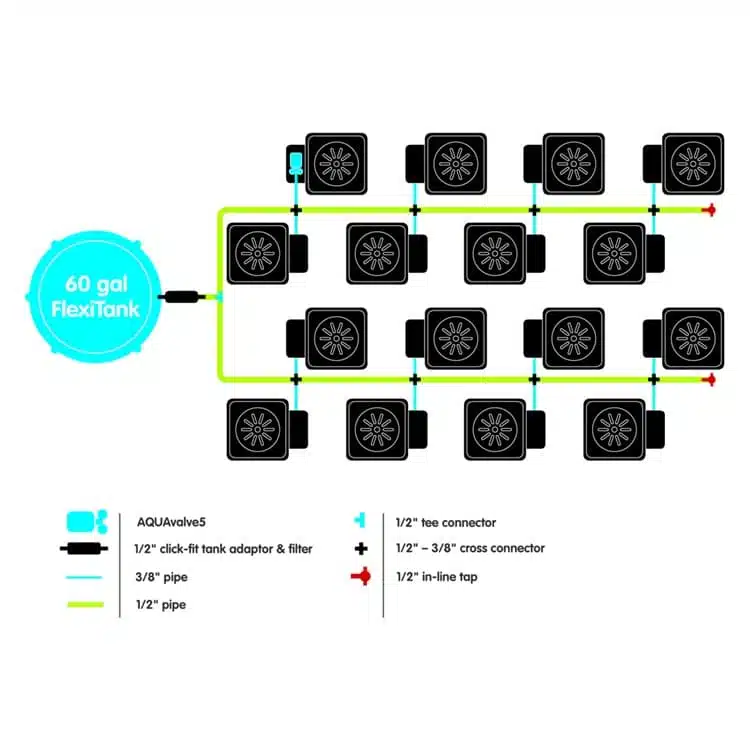 The 16Pot XL System is easily extended so many pots can be linked to a single reservoir. Please see examples of typical layouts using 3/8″ pipe or 1/2” pipe in the image gallery. The pots & trays can be easily moved at will, if the plants grow too large they can be spaced further apart with ease. Once set up and a reservoir is filled with water & liquid feed this extremely versatile system will completely take care of all your plants needs.